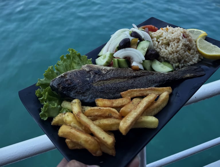 Includes a grilled fish menu with risotto, Greek salad, fries, and tzatziki, plus unlimited beers and unlimited soft drinks — the ultimate all-inclusive experience at sea